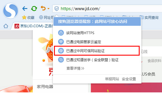搜狗瀏覽器、UC瀏覽器、遨游瀏覽器、345瀏覽器,均可在地址欄實(shí)現(xiàn)對網(wǎng)站真實(shí)身份的一鍵查驗(yàn),輕松辨識網(wǎng)站真?zhèn)?。(以搜狗瀏覽器訪問京東網(wǎng)站為例)