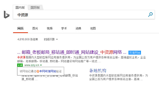 對于搜索結(jié)果中,凡是屬于已通過中網(wǎng)“可信網(wǎng)站”驗(yàn)證的正規(guī)網(wǎng)站,微軟必應(yīng)搜索都給予了專門的“認(rèn)證”標(biāo)識標(biāo)注。(以必應(yīng)搜索引擎搜索中資源為例)